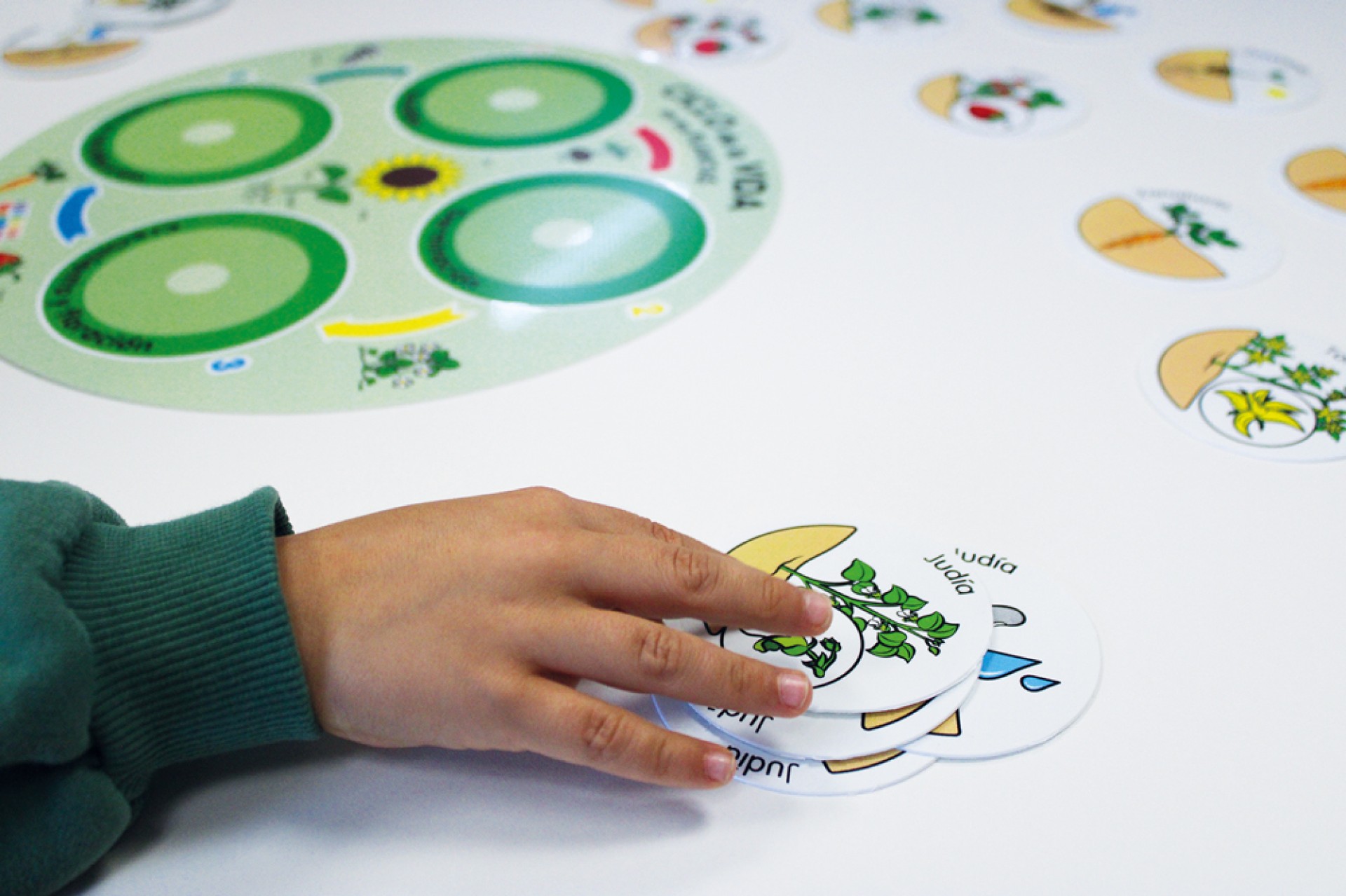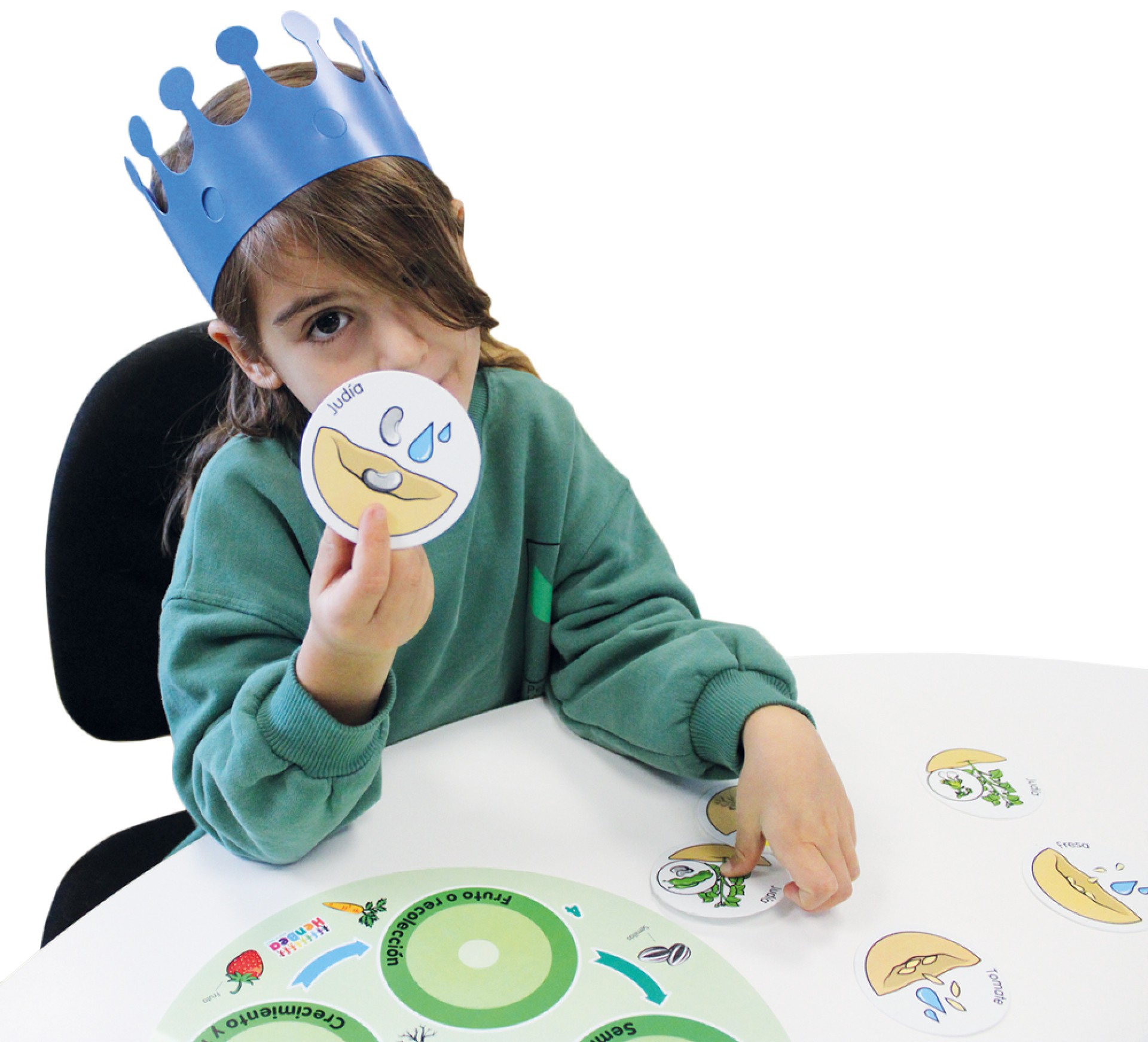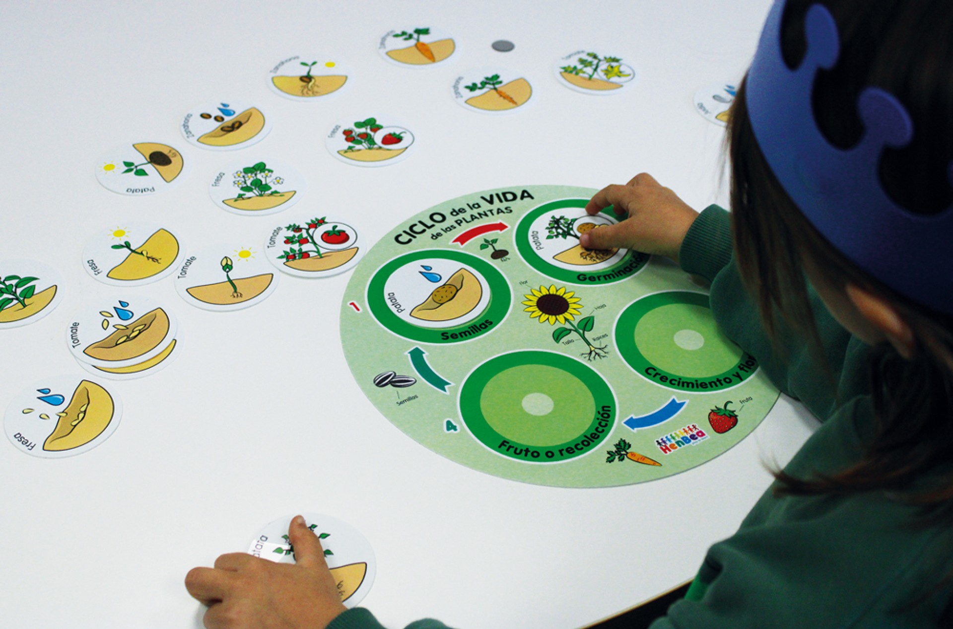 Contenido: Lámina circular + 24 fichas ilustradas de diferentes plantas (tomate, zanahoria, girasol, fresa, judía y patata) + 28 adhesivos textiles removibles.