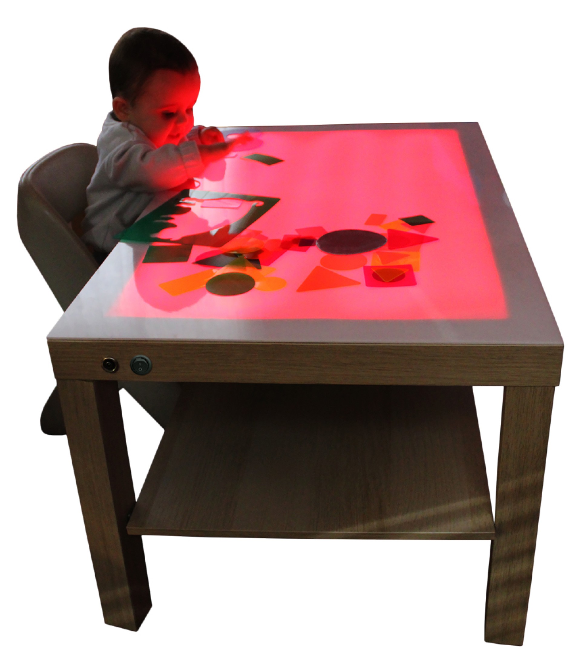 La mesa de luz está fabricada en madera de haya con una superficie de metacrilato blanco de 3 mm, que realza los colores y las texturas de los materiales utilizados. Equipada con luces LED de última generación en 12 colores diferentes, permite a los niños personalizar su experiencia de aprendizaje.